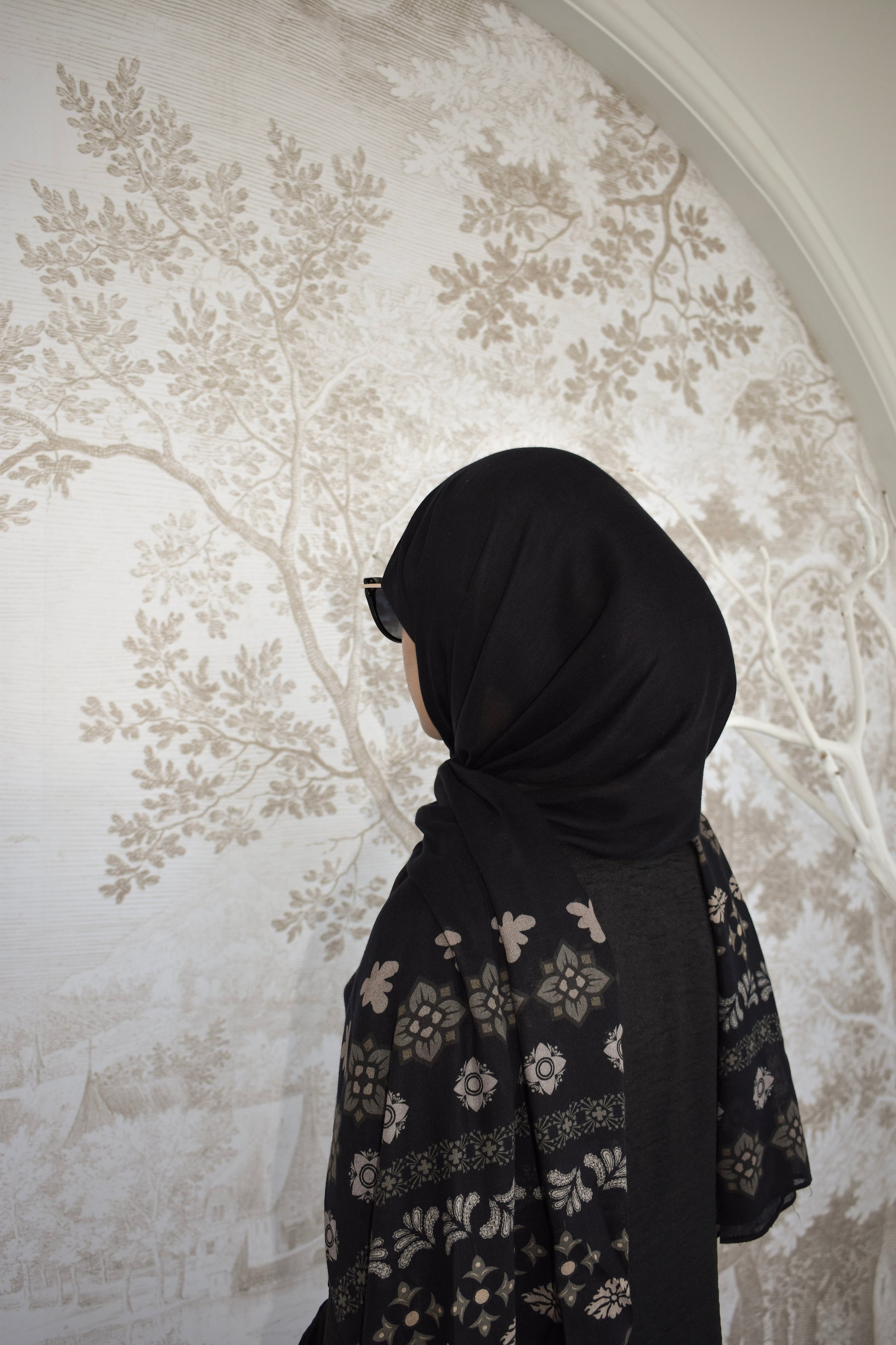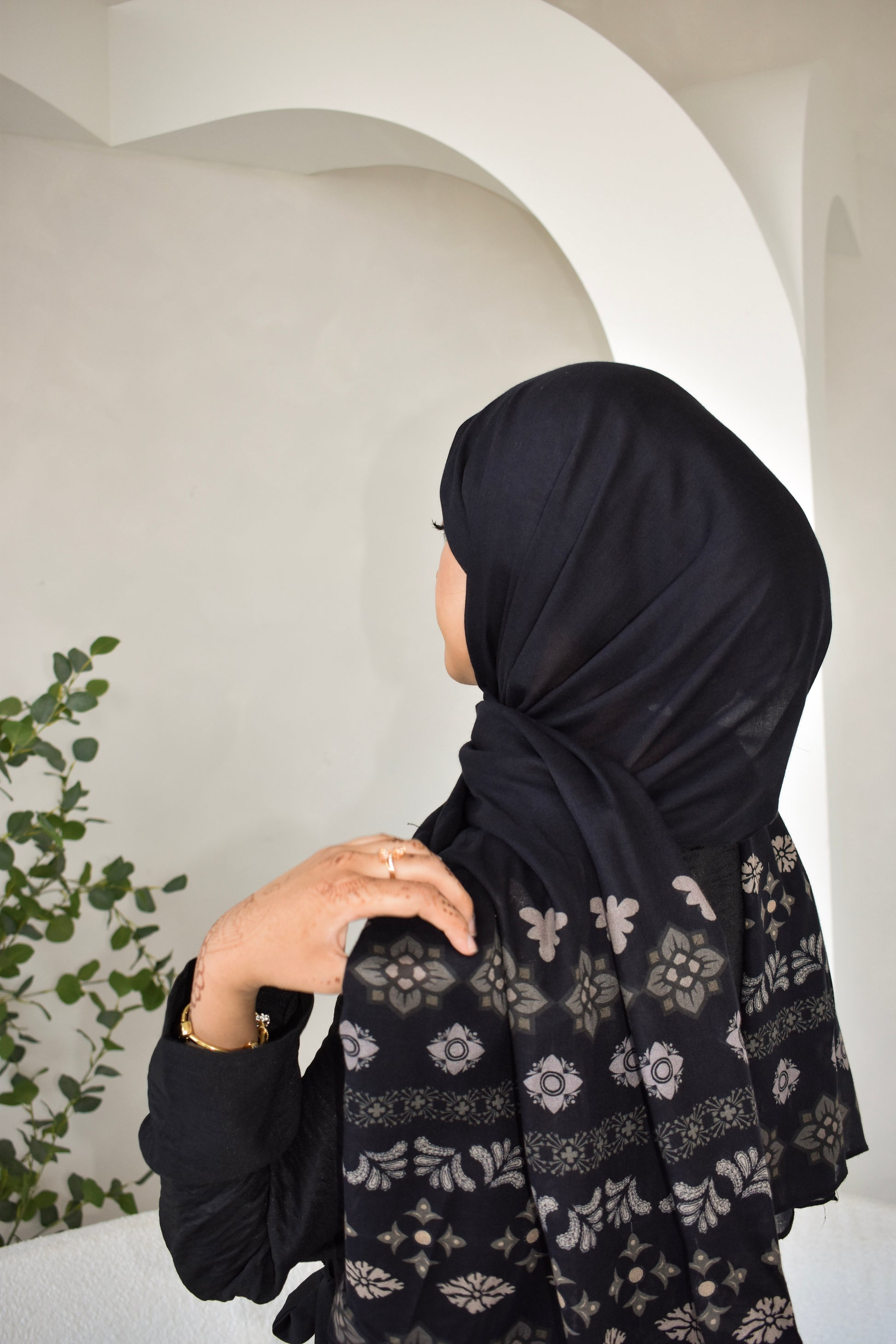 Timeless, with a quiet edge. This black modal hijab features soft cream and gray detailing at each end, drawing subtle inspiration from traditional motifs and neutral tones. Crafted from our premium double-stitched modal, it offers a breathable, fluid drape designed for effortless everyday styling.