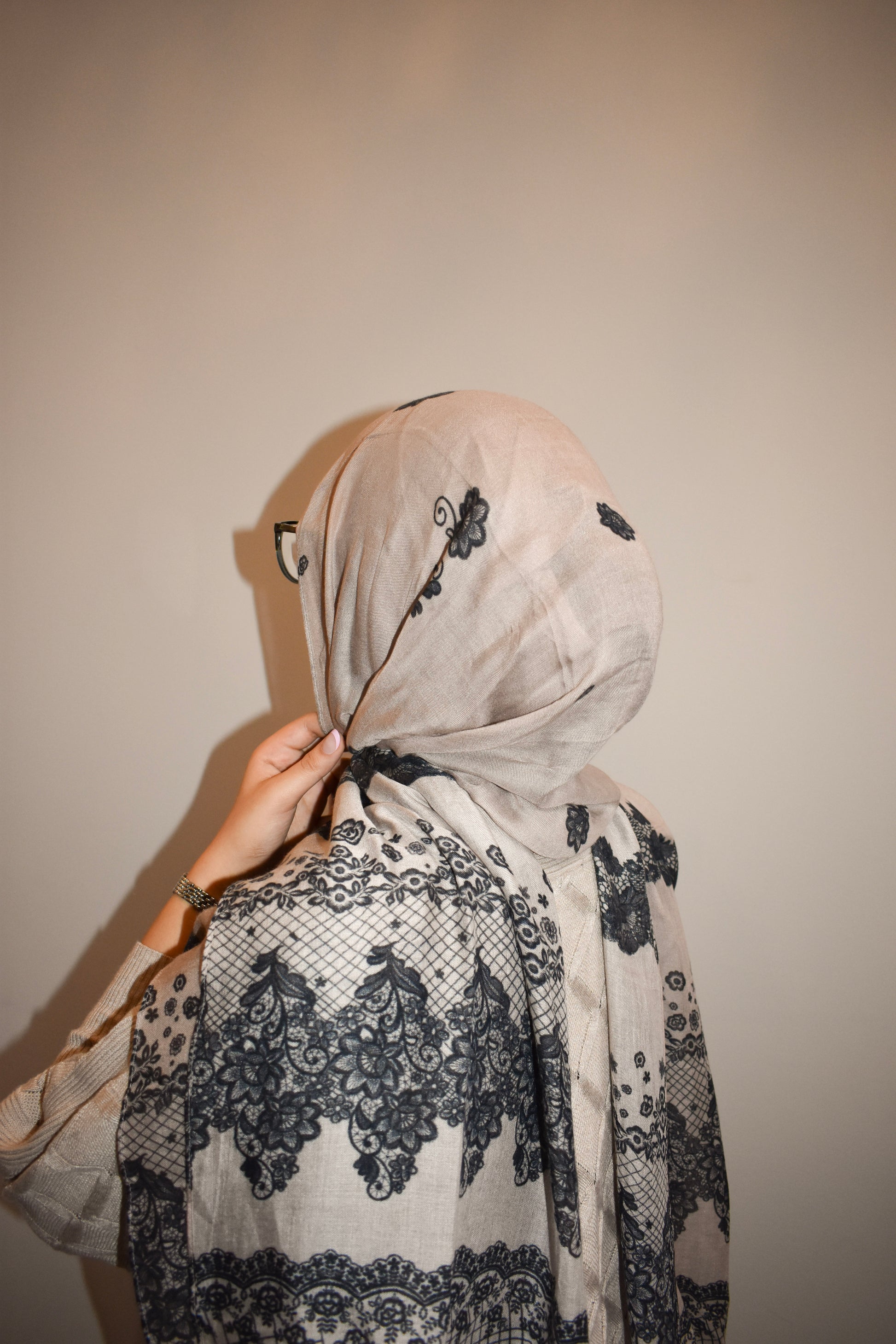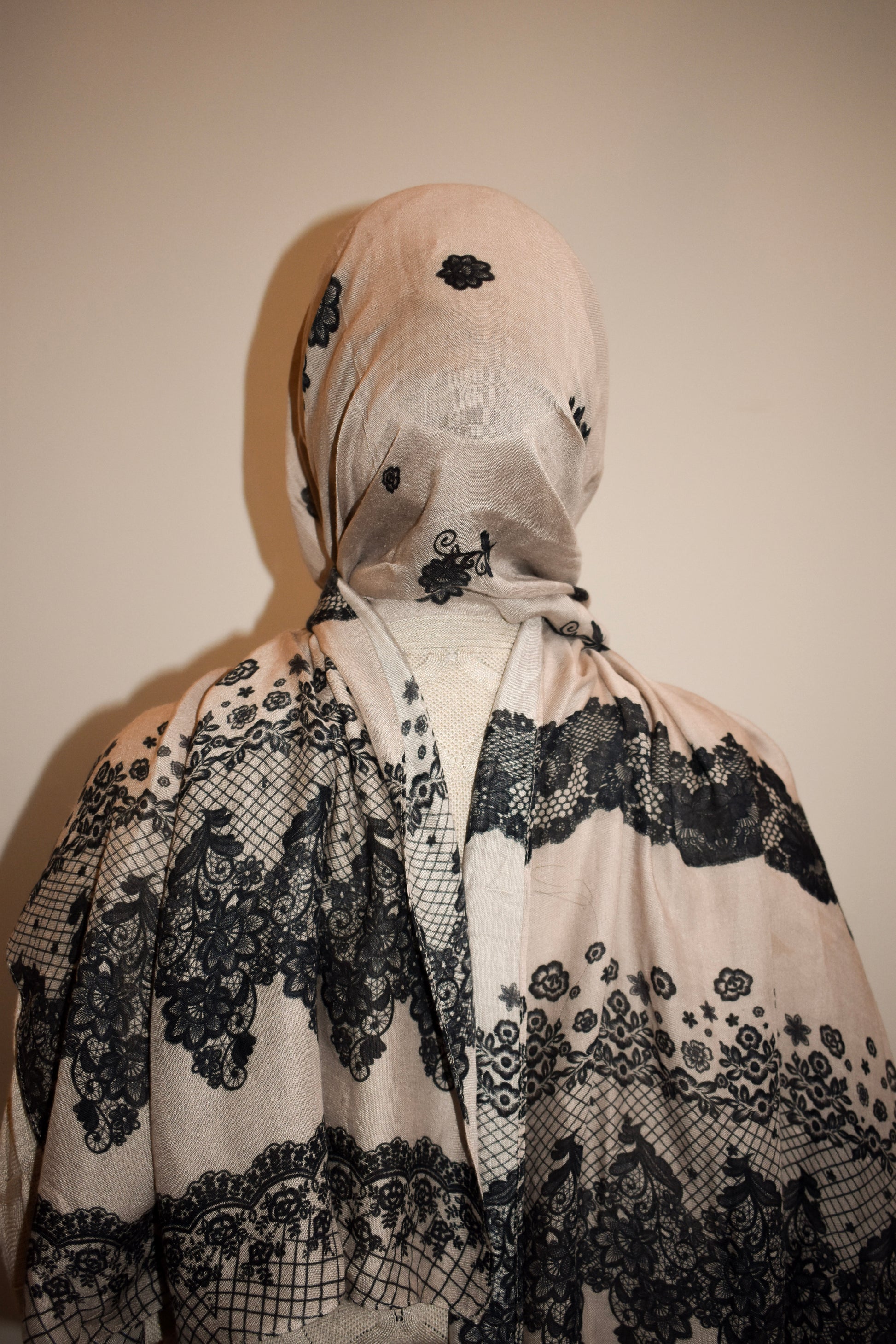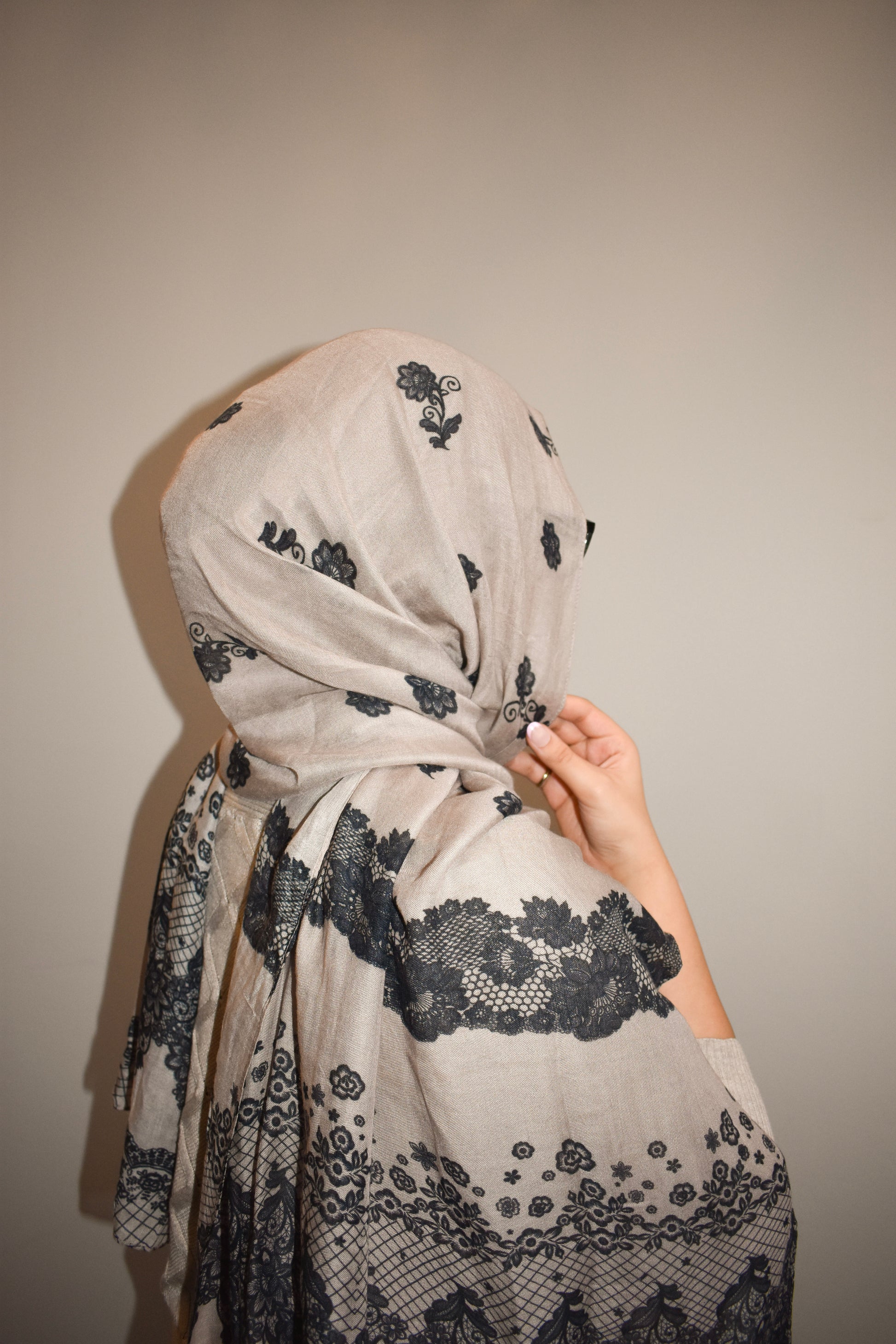 A refined neutral with subtle contrast. This hijab features a soft taupe base accented with black lace and floral detailing, bringing texture and depth to a timeless palette. Designed in-house and crafted from our premium modal, it offers breathable comfort and a fluid drape—ideal for effortless, everyday styling.